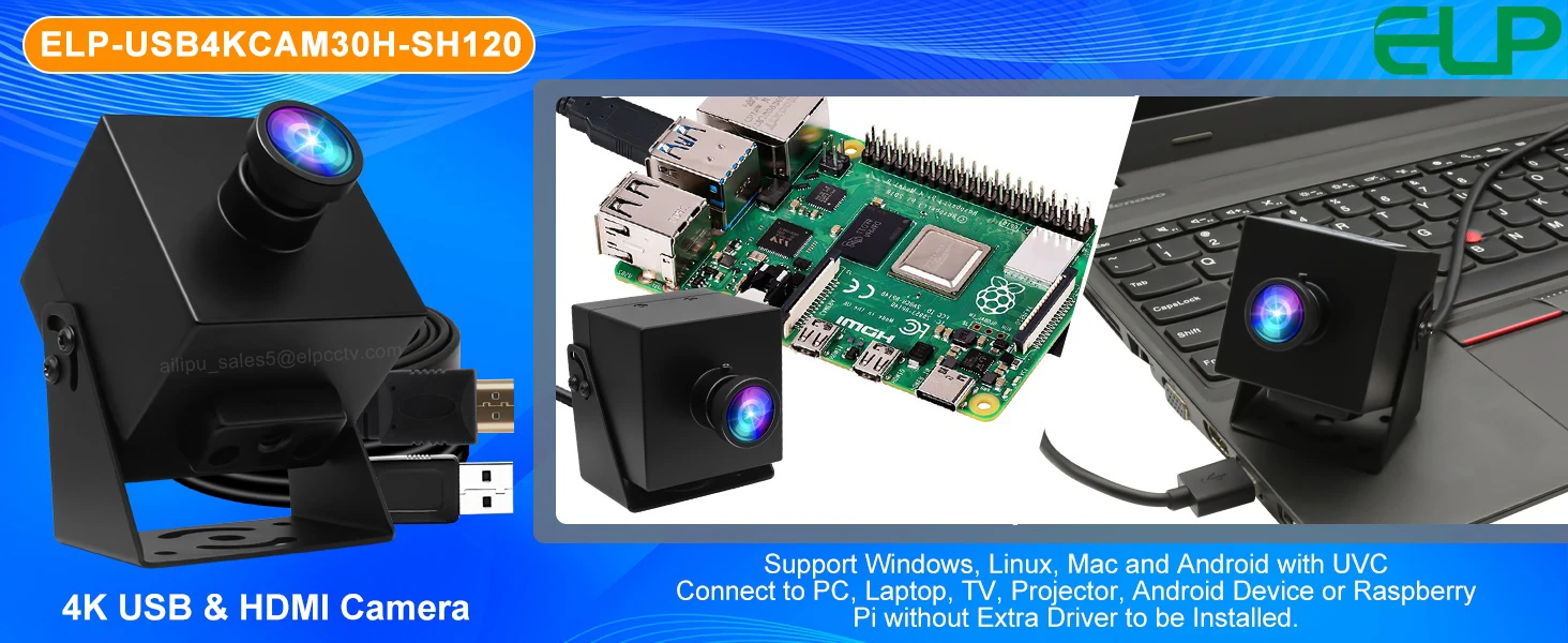 This 4K ELP-USB4KCAM30H-CFV USB3.0 HDMI Camera is a New member of ELP Cameras Family in 2024. It adopt 1/2.8″ Sony IMX415 Color CMOS sensor. With powerful H.264 Video Compression, provides you Ultra Smooth Uploading Experience. It can achieve Ultra HD 3840×2160 60fps,also Full HD 1080P 60fps Video Output, can support HDMI 4K 60FPS output. Support USB3.0 and HDMI Dual Output simultaneously. With wide angle no distortion 120 degree lens for super clear details images