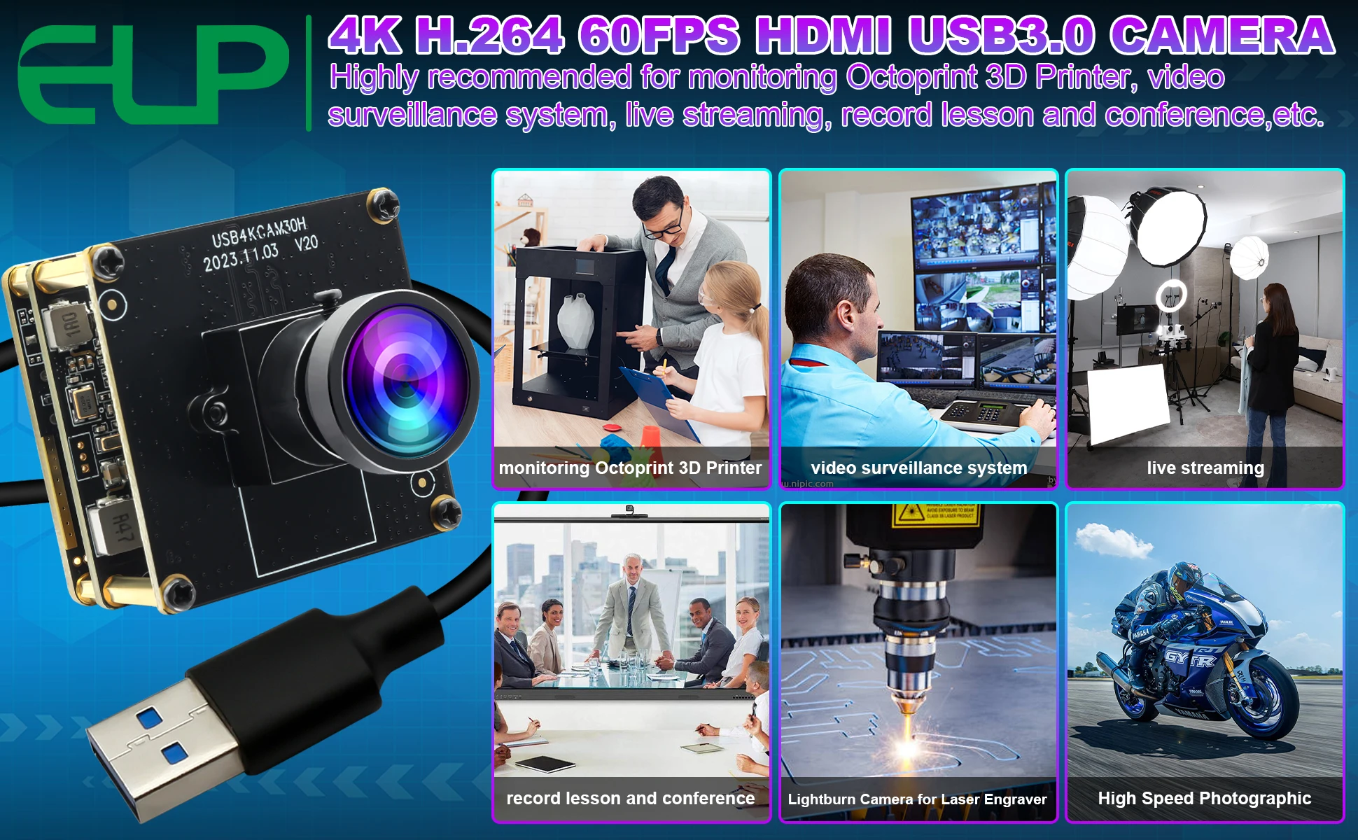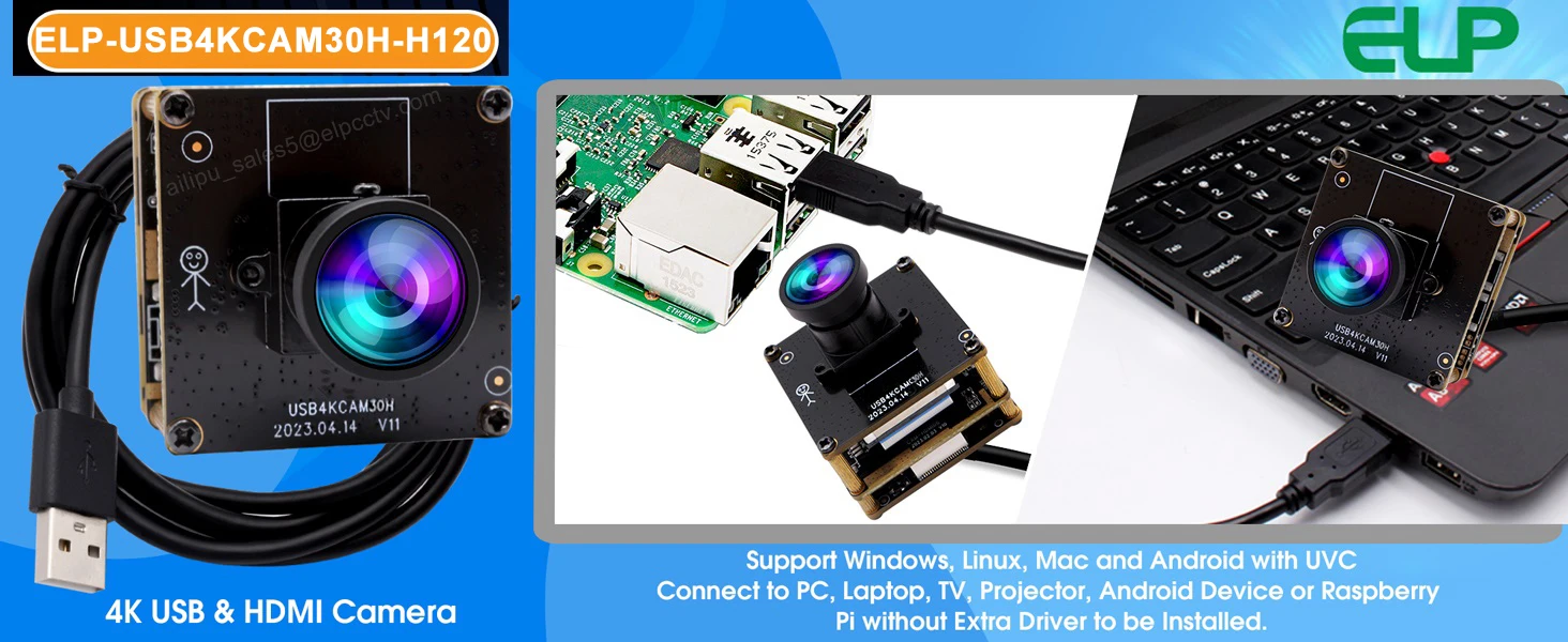 This 4K ELP-USB4KCAM30H USB3.0 HDMI Camera is a New member of ELP Cameras Family in 2024. It adopt 1/2.8″ Sony IMX415 Color CMOS sensor. With powerful H.264 Video Compression, provides you Ultra Smooth Uploading Experience. It can achieve Ultra HD 3840×2160 60fps,also Full HD 1080P 60fps Video Output, can support HDMI 4K 60FPS output. Support USB3.0 and HDMI Dual Output simultaneously. With wide angle no distortion 120 degree lens for super clear details images